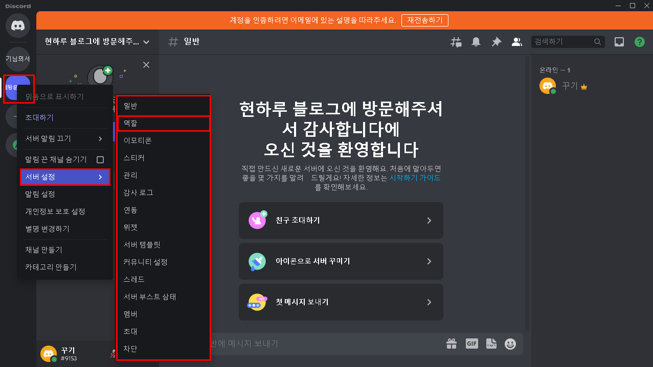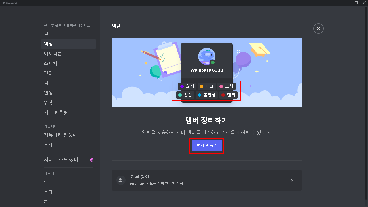 역할 설정에 들어오셔서 역할 만들기를 눌러주세요!