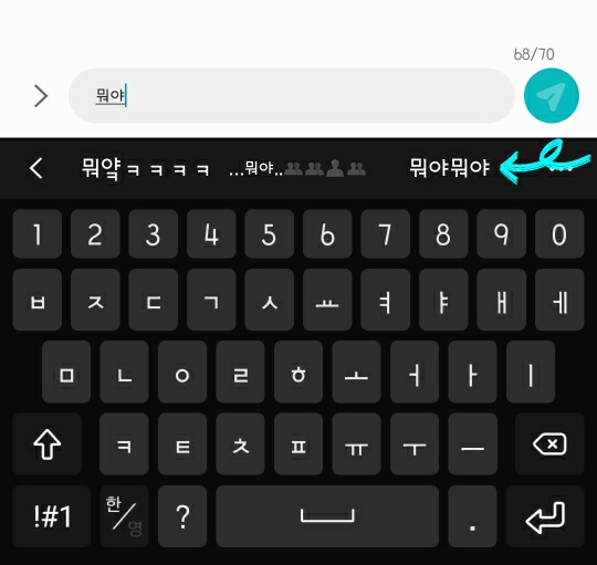 아래 사진에서 보이는 것처럼 사용자가 뭐야라는 단어를 입력했을때 하단에 단축어(뭐야뭐야, 뭐얔ㅋㅋㅋㅋ 등)가 여러개 보이는 것을 확인하실 수 있습니다.
