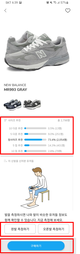 발 사이즈 촬영을 통해 측정을 마치셨다면 뉴발란스 - 993 모델의 사이즈별 유저들의 리뷰가 보입니다!