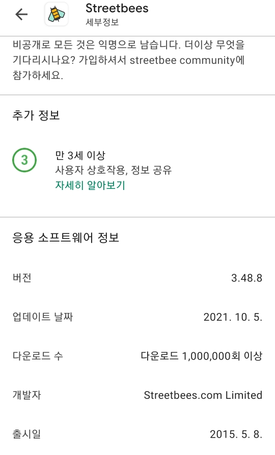 어플 출시일은 2015.05.08이며, 마지막 업데이트 날짜가 2021.10.05인걸 보면 주기적으로 관리받는 어플임을 알 수 있습니다.