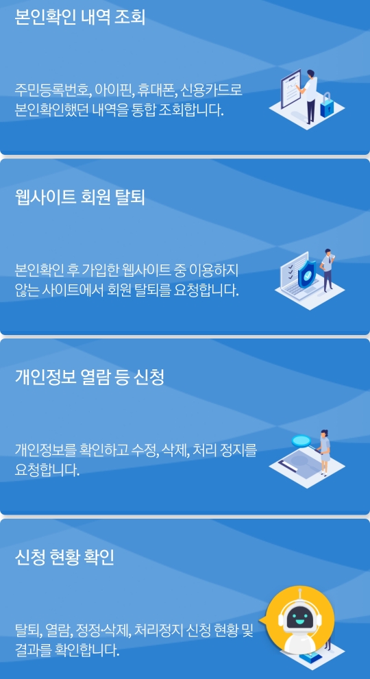위에서 언급한 본인확인 내역 조회, 웹사이트 회원 탈퇴, 개인정보 열람 등 신청, 신청 현황 확인을 할 수 있는 사이트로, 내 개인정보 보호를 위해 개인정보보호위원회에서 만든 시스템입니다.