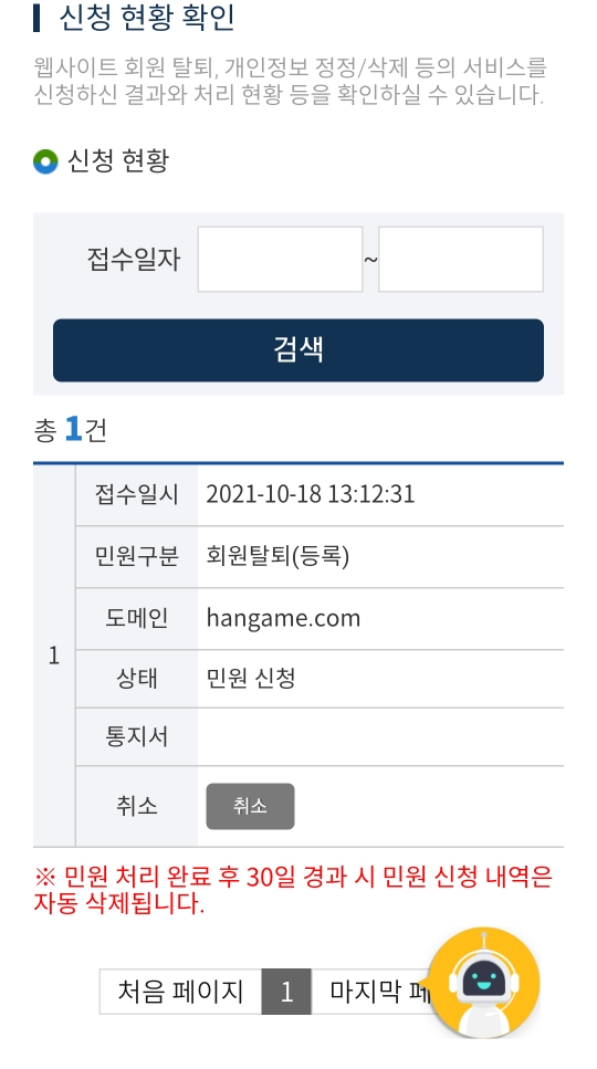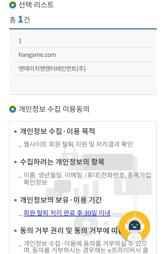 앞에서 웹사이트 탈퇴 신청, 개인정보 열람 및 정정,삭제 처리한 내역을 확인하실 수 있습니다. 앞서 제가 한게임.com 탈퇴 신청한 기록이 확인되네요.