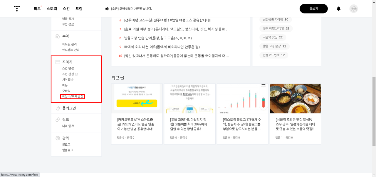 티스토리 블로그 메뉴바 / 구독 버튼 설정