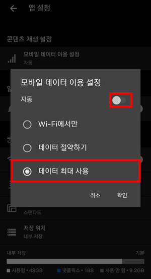앱 설정 - 모바일 데이터 이용 설정 - 자동 체크 해제 - 데이터 최대 사용 선택