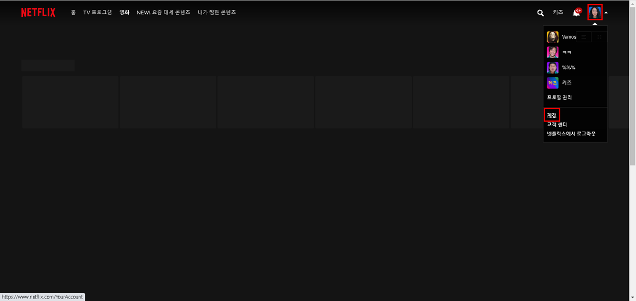 먼저 넷플릭스에 접속한 후 우측 상단에 본인 계정 버튼을 눌러주세요!