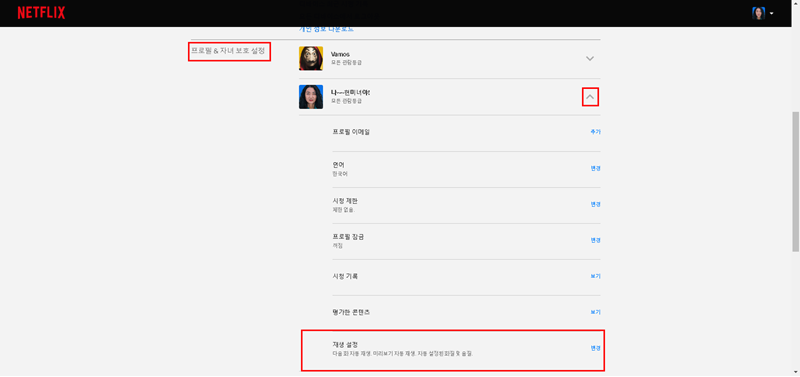 계정 접속 후 하단에 프로필 & 자녀 보호 설정 - 재생 설정 변경 누르기