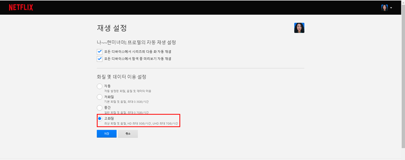 재생 설정 - 화질 및 데이터 이용 설정 - 고화질 선택