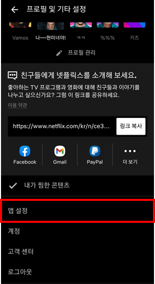 계정을 누르면 프로필 및 기타 설정에서 하단에 앱 설정 버튼을 눌러주세요!