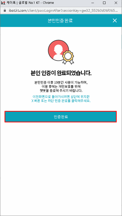로그인 또는 PASS인증을 완료하면 본인인증 완료 창이 나타납니다.