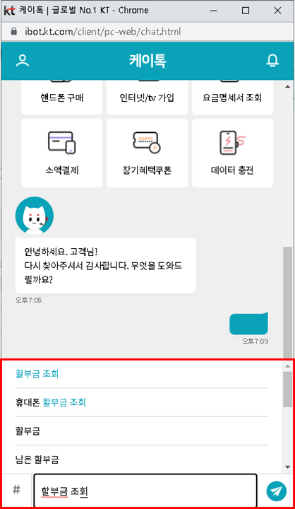 저는 여기서 휴대폰 할부금 조회를 선택해서 채팅을 보내보겠습니다.