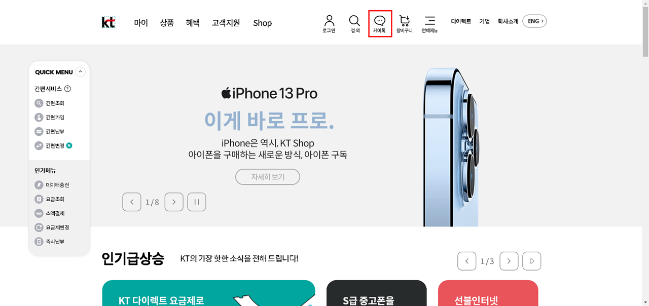 KT 홈페이지에 접속하면 상단 메뉴바에 케이톡 서비스를 바로 찾으실 수 있습니다.