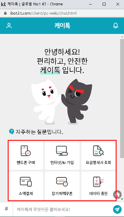 위에 보이는 6가지 UI 버튼 말고도 대화로도 케이톡 챗봇과 대화를 나눌 수 있습니다.