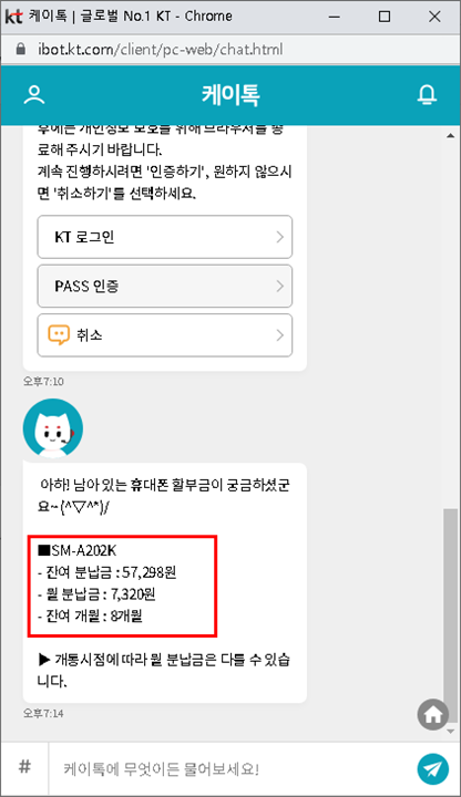 휴대폰 할부금 조회를 채팅창에 보내면 케이톡(챗봇)이 KT로그인 또는 PASS인증을 요구합니다.