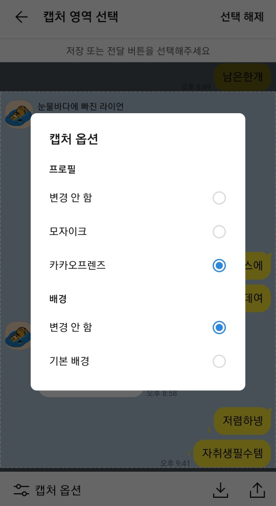 그럴때 카카오톡 대화방 안에서 캡처 기능을 사용하여 프로필 사진과 실명을 모자이크 또는 카카오프렌즈가 그려진 사진으로 대체할 수 있는 기능입니다.