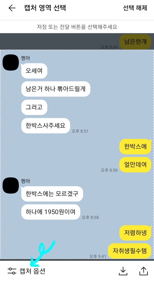 저는 일반적으로 핸드폰 자체의 캡처 기능을 사용하고 있었는데 카카오톡에서 이렇게 편한 캡처 기능을 제공하고 있다니 너무 편리하게 사용할 수 있어서 좋은 것 같습니다.