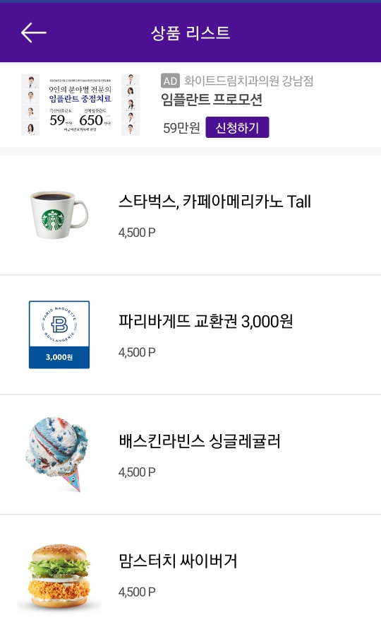 포인트로 상품 받기 버튼을 클릭하면 교환 가능한 상품 리스트 확인 가능