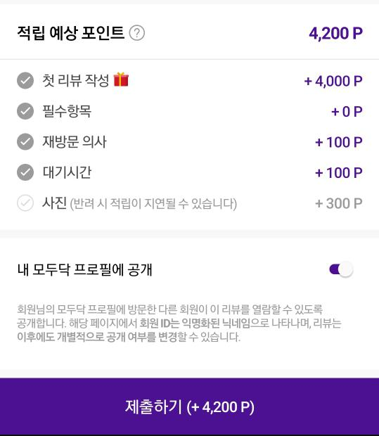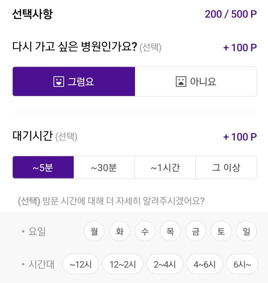재방문 의사, 진료시간, 병원 사진을 선택함으로써 포인트를 추가로 받을 수 있습니다.