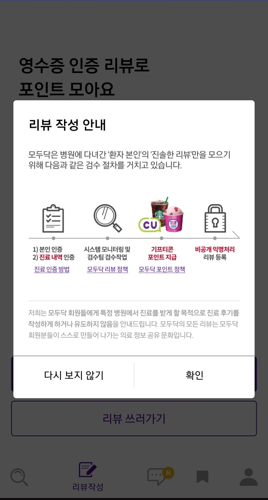본인인증을 거친 진솔한 병원리뷰플랫폼! 다녀온 병원 리뷰를 남기면 기프티콘 지급!