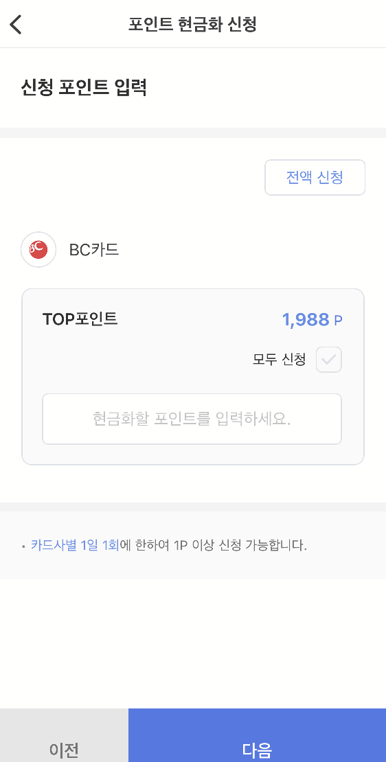 하단 메뉴탭 중 카드를 선택하고 상단 메뉴탭 중 포인트 현금화를 선택하셔서 현금화 가능한 포인트를 확인해보세요.