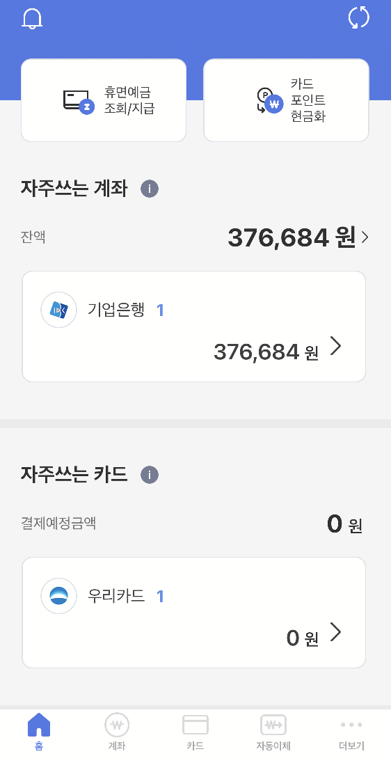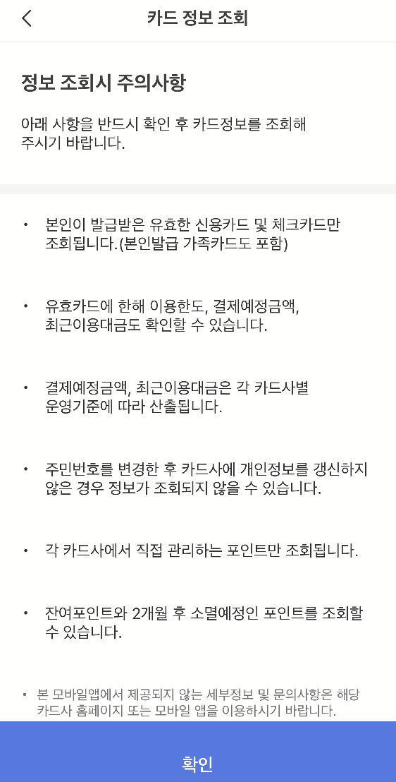 확인한 은행, 카드사 중 자주쓰는 것들은 즐겨찾기(⭐별 모양 선택) 버튼을 눌러서 홈 화면에서도 한눈에 확인 가능합니다.