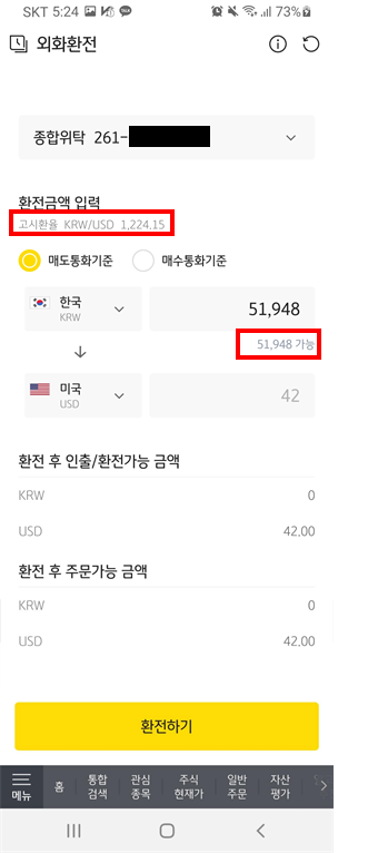 고시환율 KRW/USD 1.224.15 적용된 달러 42를 확인할 수 있습니다.