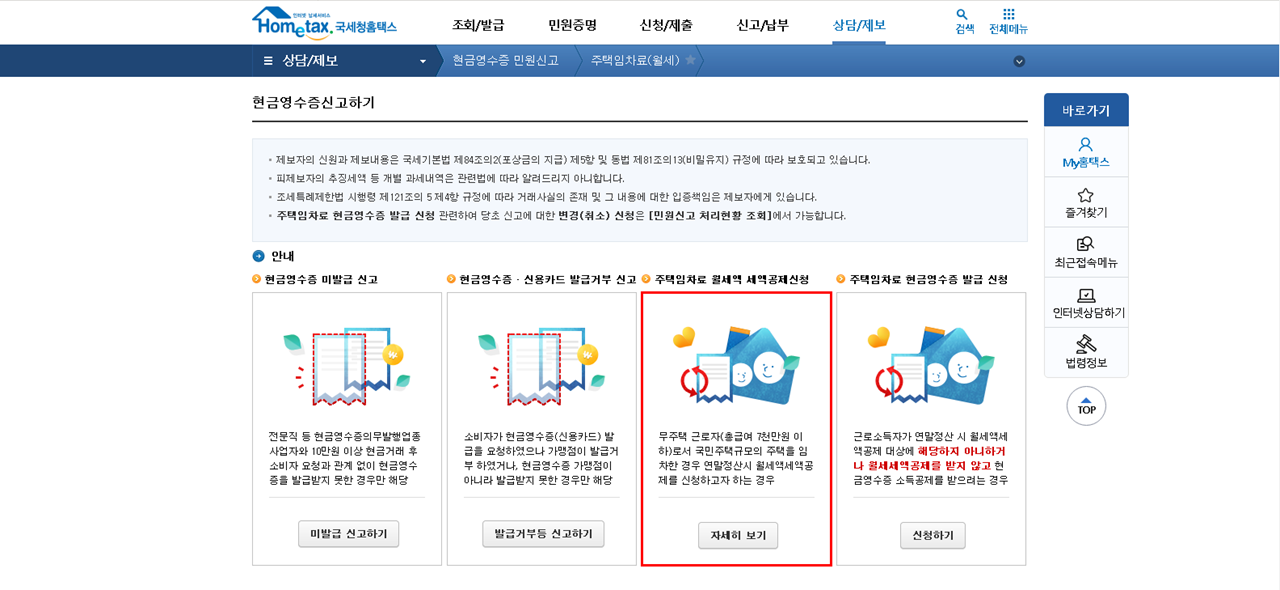 상담/제보 - 현금영수증 민원신고 - 주택임차료(월세) 선택