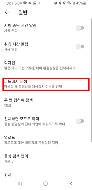 피드에서 재생 - 사용 안함 선택