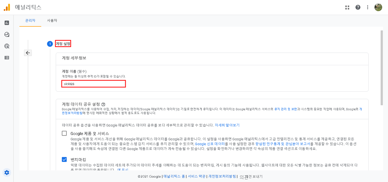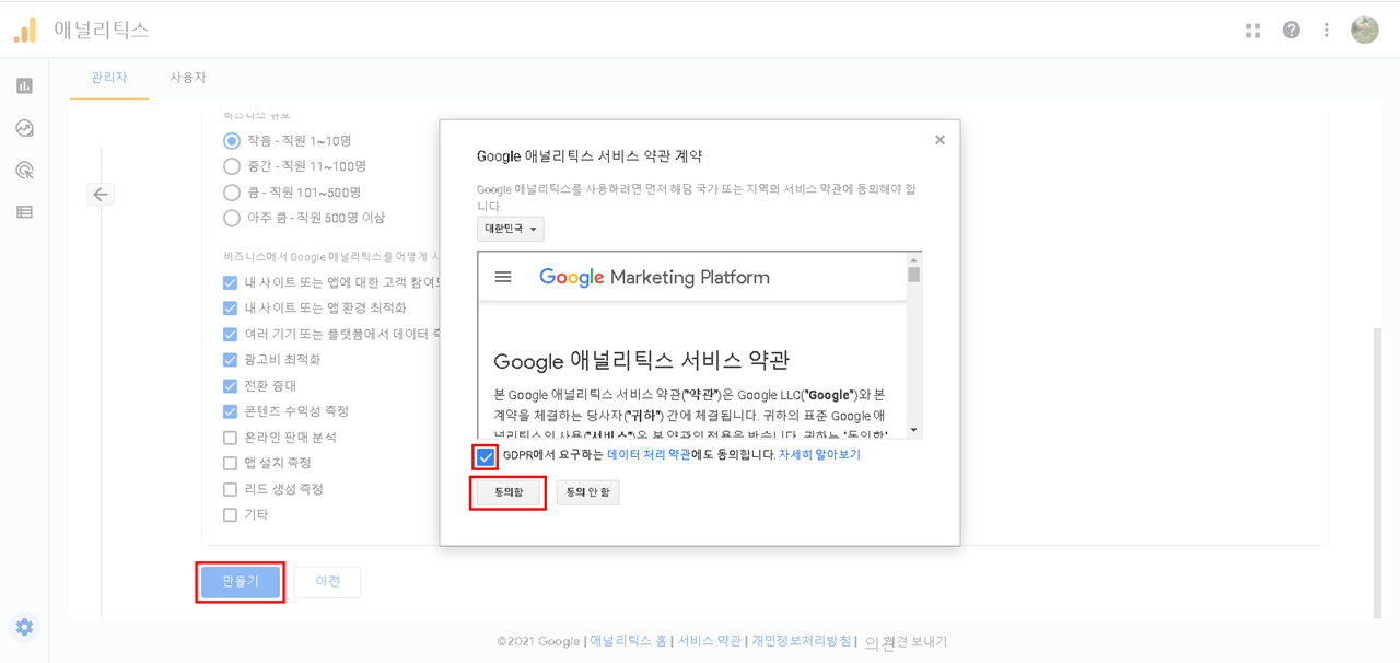 만들기 - 애널리틱스 서비스 약관 동의 체크 후 동의함 선택