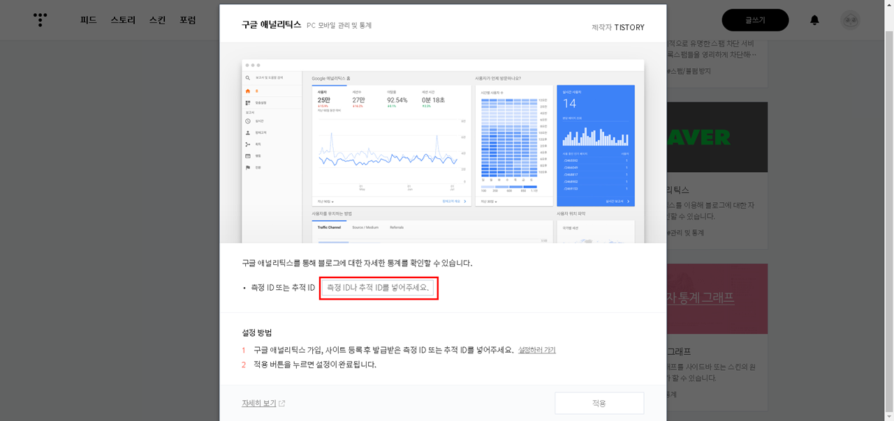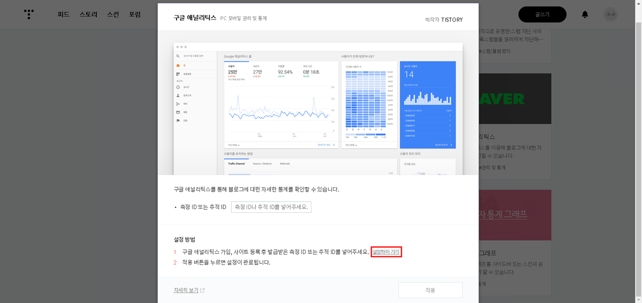 다시 티스토리로 돌아와서 플러그인 - 구글 애널리틱스 선택 - 복사한 측정 ID 입력