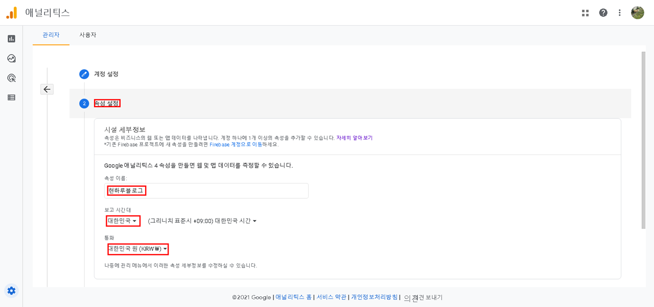 속성 설정 - 속성 이름(분석할 대상에 이름을 지어주신다고 생각하시면 됩니다.), 보고 시간대(대한민국으로 변경하기), 통화(대한민국 원으로 변경하기)