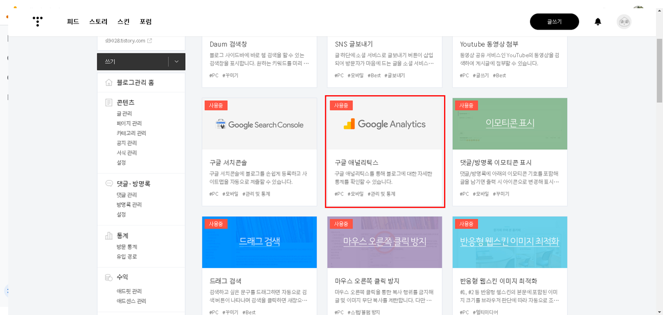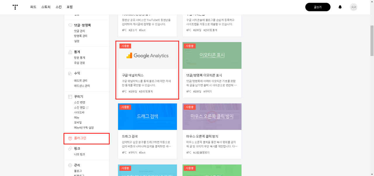 티스토리 좌측 메뉴 - 플러그인 - 구글 애널리틱스 선택