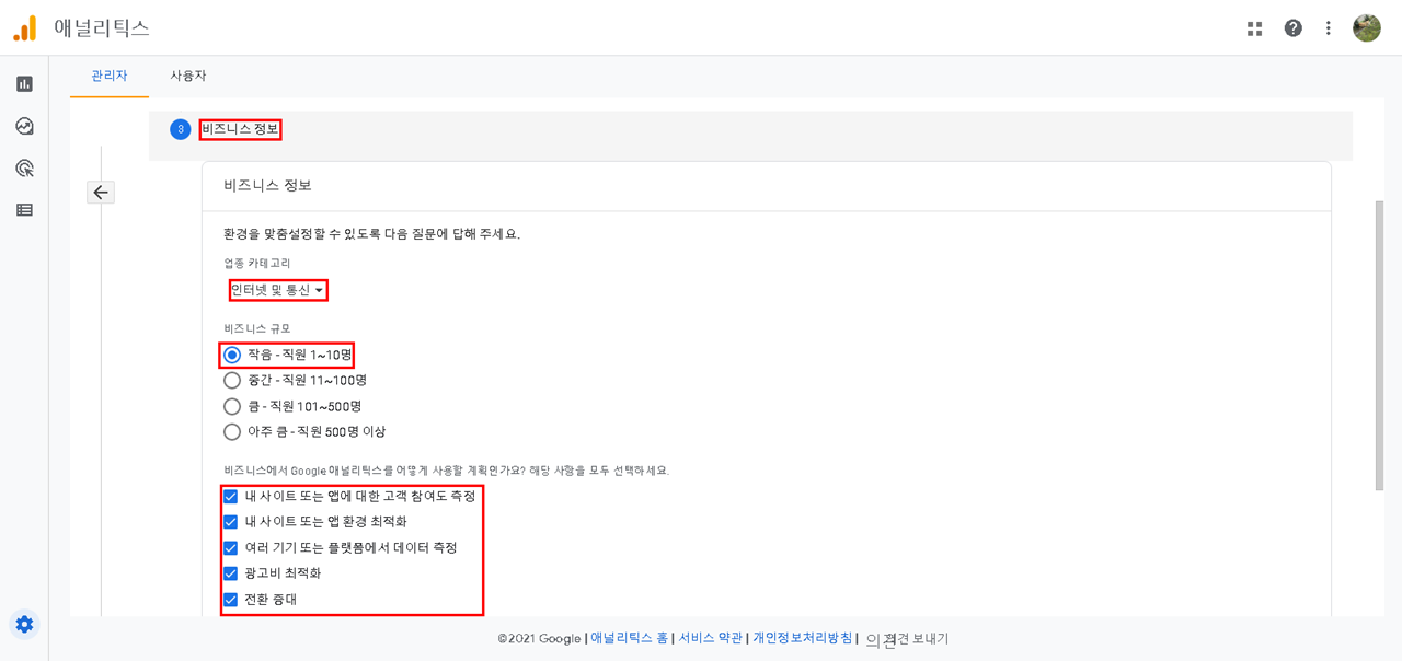 비즈니스 정보 - 업종 카테고리 선택, 비즈니스 규모 선택, 구글 애널리틱스 사용 계획 선택