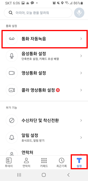 T전화를 실행시키고 T설정 - 통화 자동녹음 선택