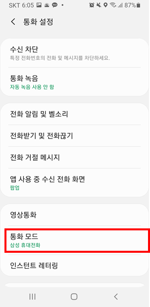 통화 모드가 삼성 휴대전화인 경우 해당 설정에서 통화 녹음 설정이 가능하고