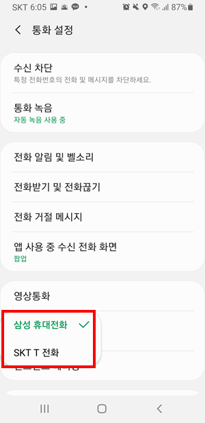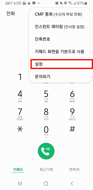 SKT T전화를 사용할 경우 T전화 설정으로 들어가셔야 합니다