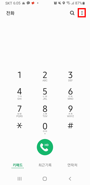 갤럭시 핸드폰의 기본 기능인 전화에 접속하시면 우측 상단에 점 3개가 세로로 있는 버튼이 있습니다.