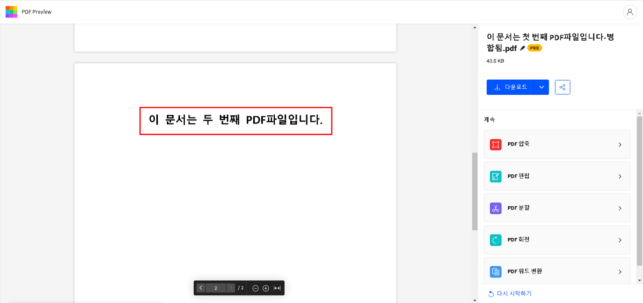 두 개의 PDF 파일이 합쳐진 후 하나의 파일이 된 것을 확인하실 수 있습니다.