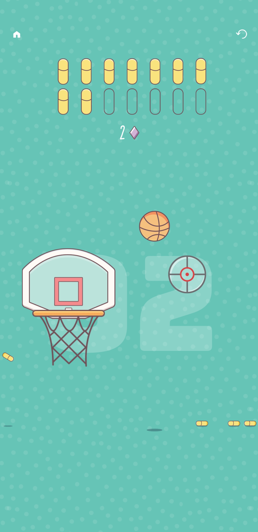 블래스트 모드는 농구공에 붙어있는 다트 건을 기준으로 화면을 터치하면서 방향을 설정하고 공을 골대 안으로 넣어서 점수를 측정하는 방식입니다. 그림 상단에 나와있는 노란색 총알은 플레이 시 적용되는 터치 횟수를 나타냅니다.