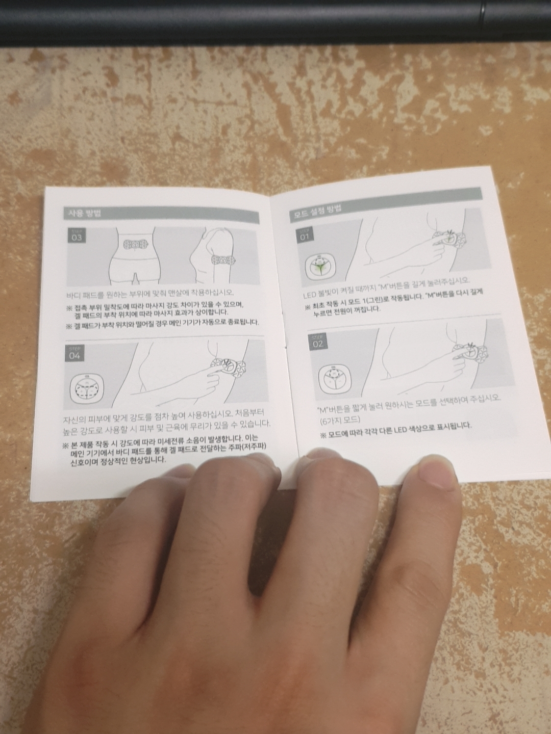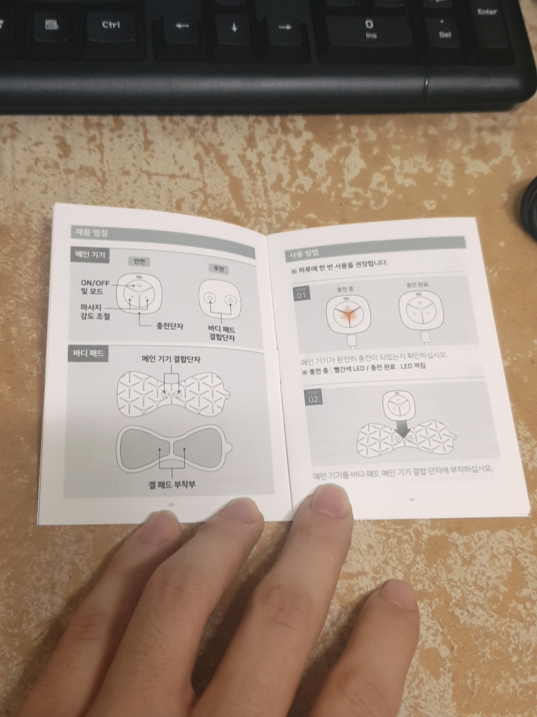 리모컨을 커내고 안에있는 내용물을 확인해봤더니 사용설명서와, 바디 패드 3장, C타입 충전 케이블, 휴대용 파우치가 들어있었습니다.
