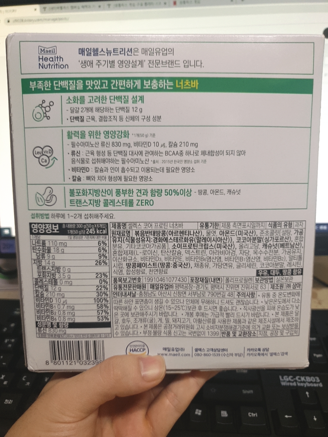 저는 운동을 하면서 부족한 단백질 섭취량을 프로틴과 닭가슴살로 채우곤 했었는데요! 아침, 저녁 닭가슴살과 퇴근 전 프로틴 한잔으로는 약 60~70g의 단백질을 섭취하기 때문에 더 많은 단백질 보충을 위해서 셀렉스 코어 프로틴 너츠바를 추가해 줬습니다.