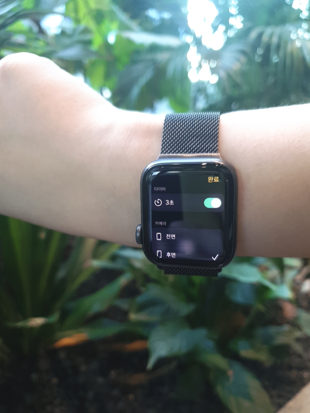 애플워치와 아이폰을 블루투스 연동을 해놓으면 애플워치로 카메라 기능을 사용할 수 있습니다. 아이폰이 바라보는 시점을 애플워치에서 확인할 수 있으며, 타이머 설정도 가능합니다. 먼거리에서 삼각대로 셀카를 찍고 싶을때 사용하면 좋겠죠?