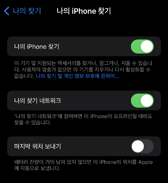 iCloud 나의 아이폰 찾기 기능을 사용하기 위해 핸드폰 설정 - 나의 iPhone 찾기 기능을 사전에 활성화 시켜주셔야 합니다.