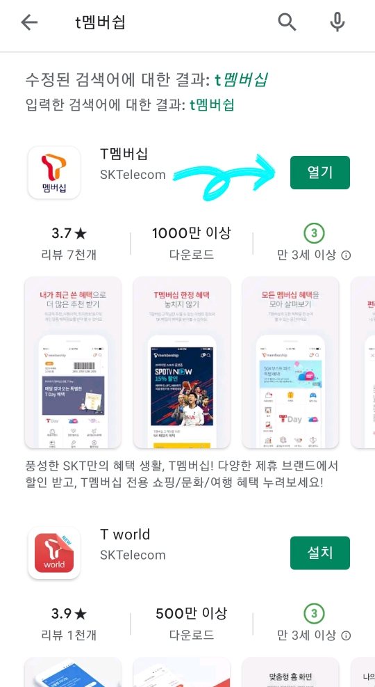 1. 먼저 구글플레이스토어에서 t멤버쉽 이라고 검색 후 열어줍니다.(skt고객은 설치되어 있을겁니다!)