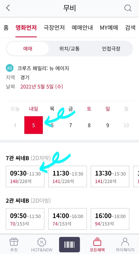 6. 관람하실 날짜와 시간을 선택해주세요! 영화관마다 상영시간이 다르니 참고해서 예매하시면 됩니다.