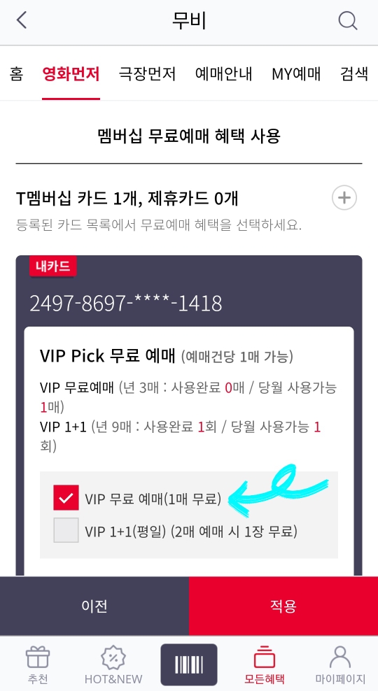 10. 마지막으로 무료 예매 혜택 2가지중에서 하나를 선택하신 후 적용을 누르시면 됩니다.
