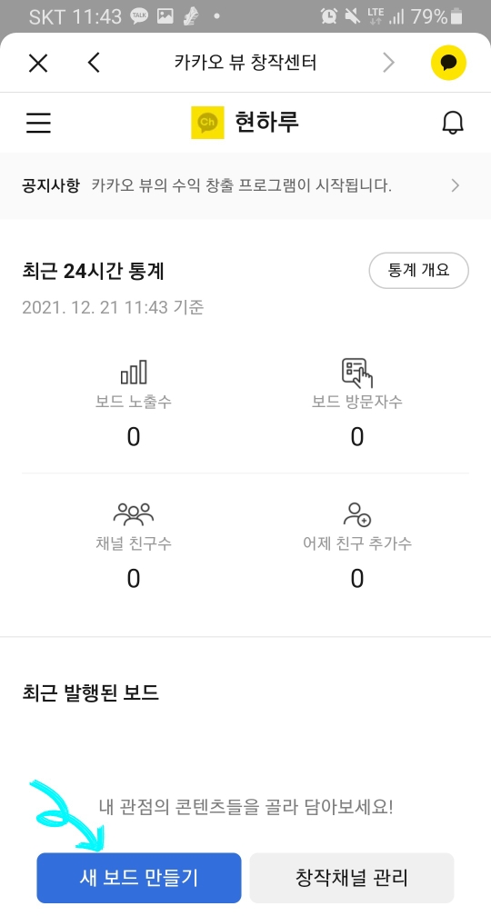 채널을 만든 이후 본격적으로 보드 만들기를 진행합니다. 새 보드 만들기로 콘텐츠를 만드실 수 있으며, 보드 발행 준비하기에 있는 카카오TV, 티스토리, 유튜브, 인스타그램을 통해 원래 있던 본인의 콘텐츠들을 연동할 수 있습니다!
