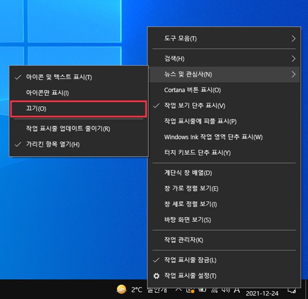 끄기 이후 작업표시줄에서 사라진 뉴스 및 관심사를 확인하실 수 있습니다.