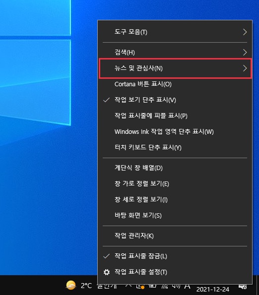 작업표시줄 뉴스 및 관심사가 있는 곳에서 마우스 우클릭을 하시면 뉴스 및 관심사 항목이 보입니다.