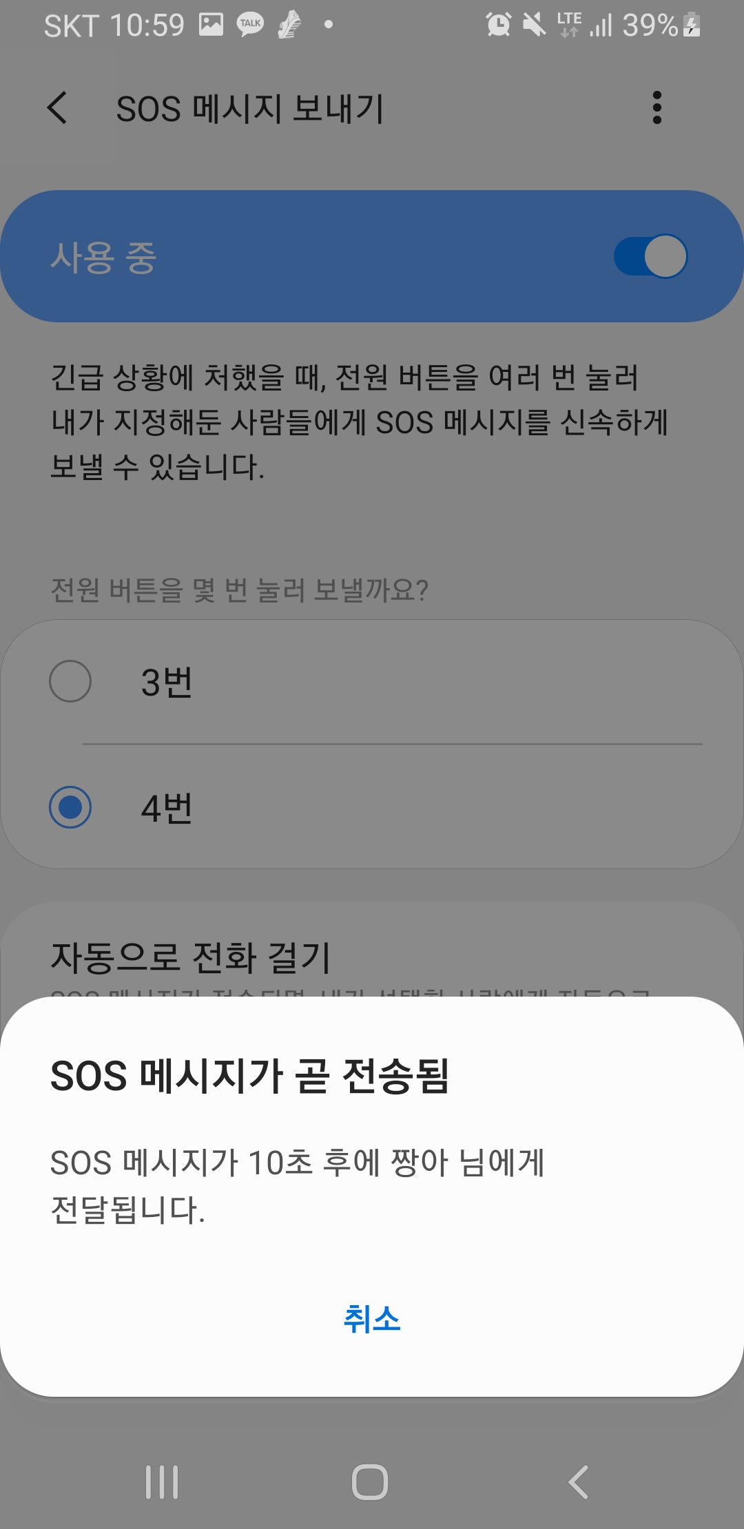 그렇다면 실수로 전원 버튼을 눌러서 메시지가 바로 보내지면 어떡하지?라고 생각하실 수도 있습니다. 그럴 때를 대비해서 10초 동안 SOS 메시지를 보낼 것인지 확인하는 안내 메시지가 나타나고 실수라면 취소할 수 있는 버튼이 있어서 눌러주시면 됩니다.