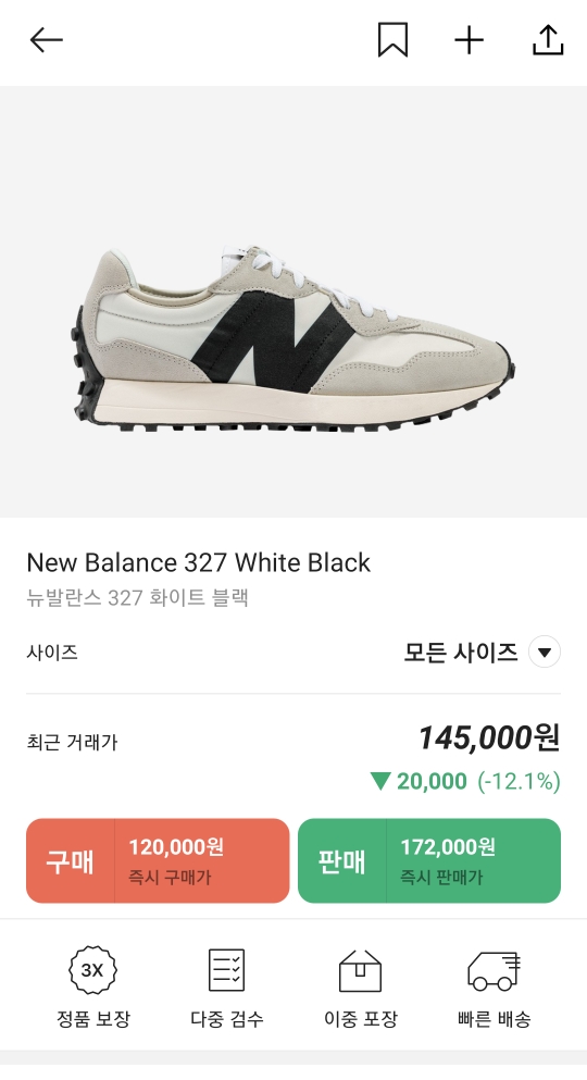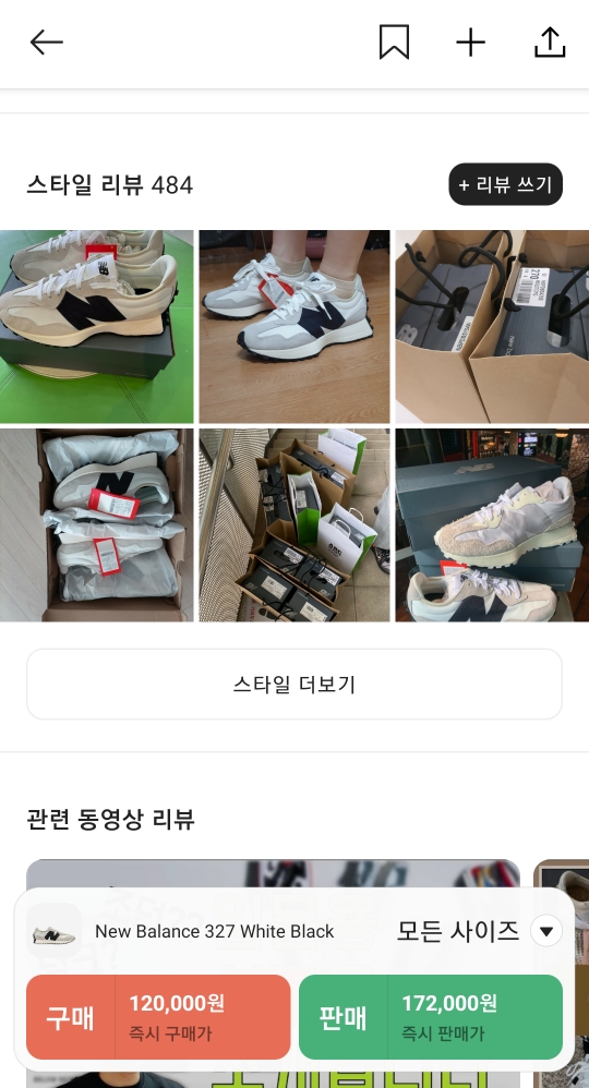 4. 검색을 하게되면 아래 사진처럼 상품의 가격이 나타납니다! 여기서 본인이 신을 사이즈를 고르려면 중간에있는 모든 사이즈를 눌러주시면 됩니다.!